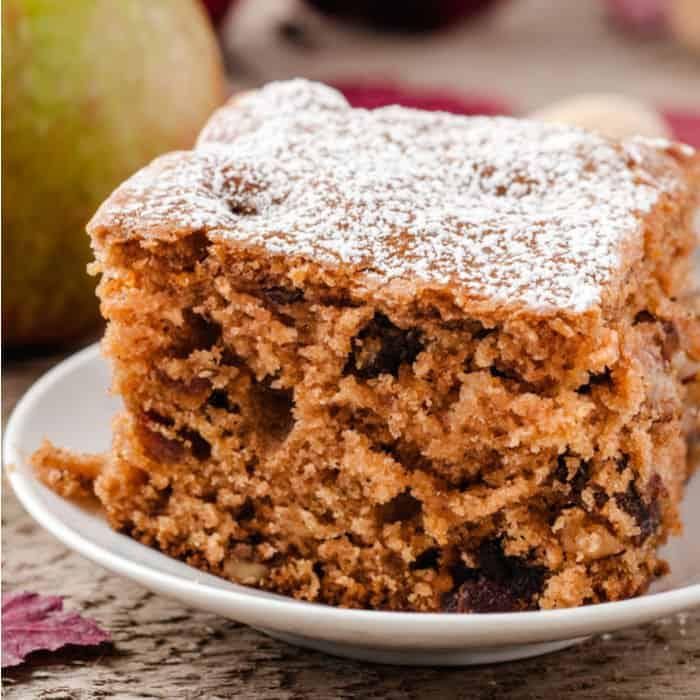 This delicious applesauce walnut cake recipe is lightly spiced but full of warm and cozy flavors. Gooey, moist and full of texture, this apple cake is full of flavor and can easily be made all fall and winter long. This recipe uses applesauce instead of fresh apples while still packing tons of flavor.