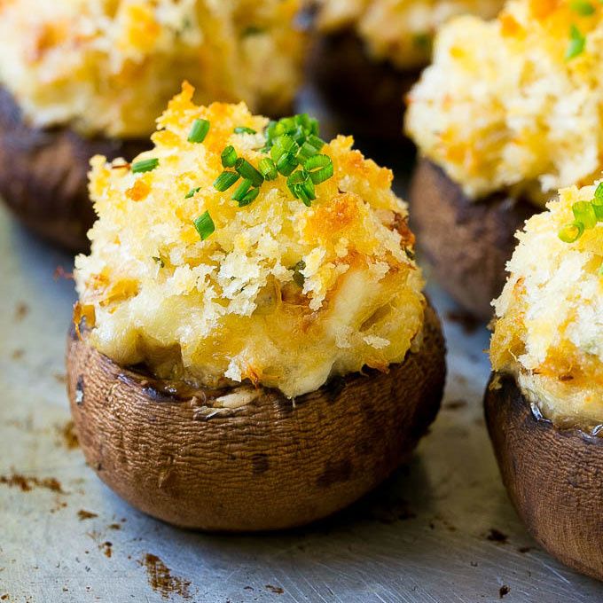 These crab stuffed mushrooms are mushroom caps filled with flaked crab and three types of cheese, then baked to golden brown perfection. An easy and elegant appetizer that can be assembled ahead of time!