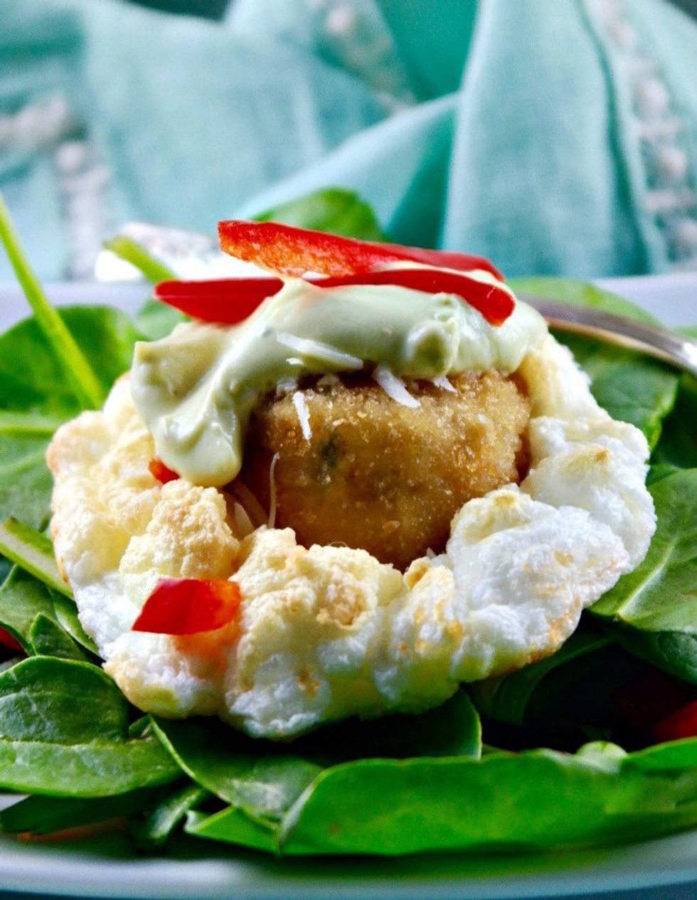 Gardein Mini Crabless Cakes in Clouds of egg whites flavored with pecorino romano cheese. This protein packed dish is an excellent appetizer or brunch entree! Served with creamy avocado sauce!
