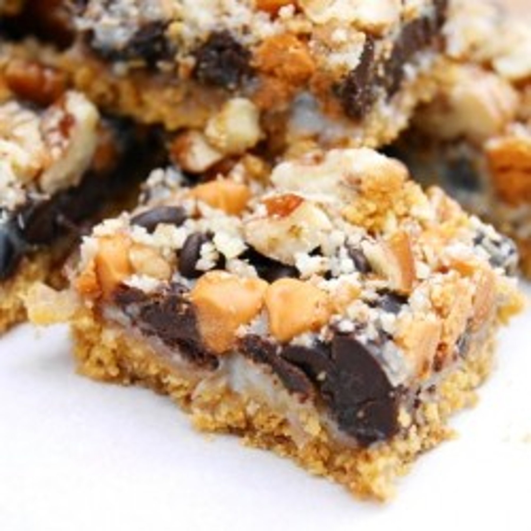 Preheat oven to 320 deg F. Melt butter and pour in a 9x13 inch pan. Crush graham crackers in a bag or use a blender. Sprinkle over the butter and pat it down. Add all 3 of the bags of chips. I like to alternate between them. Sprinkle coconut over the top, drizzle the sweetened condensed milk - yes the whole can, and bake for 20 minutes or until coconut starts to brown. Let it cool for 20 minutes, then cut and serve.