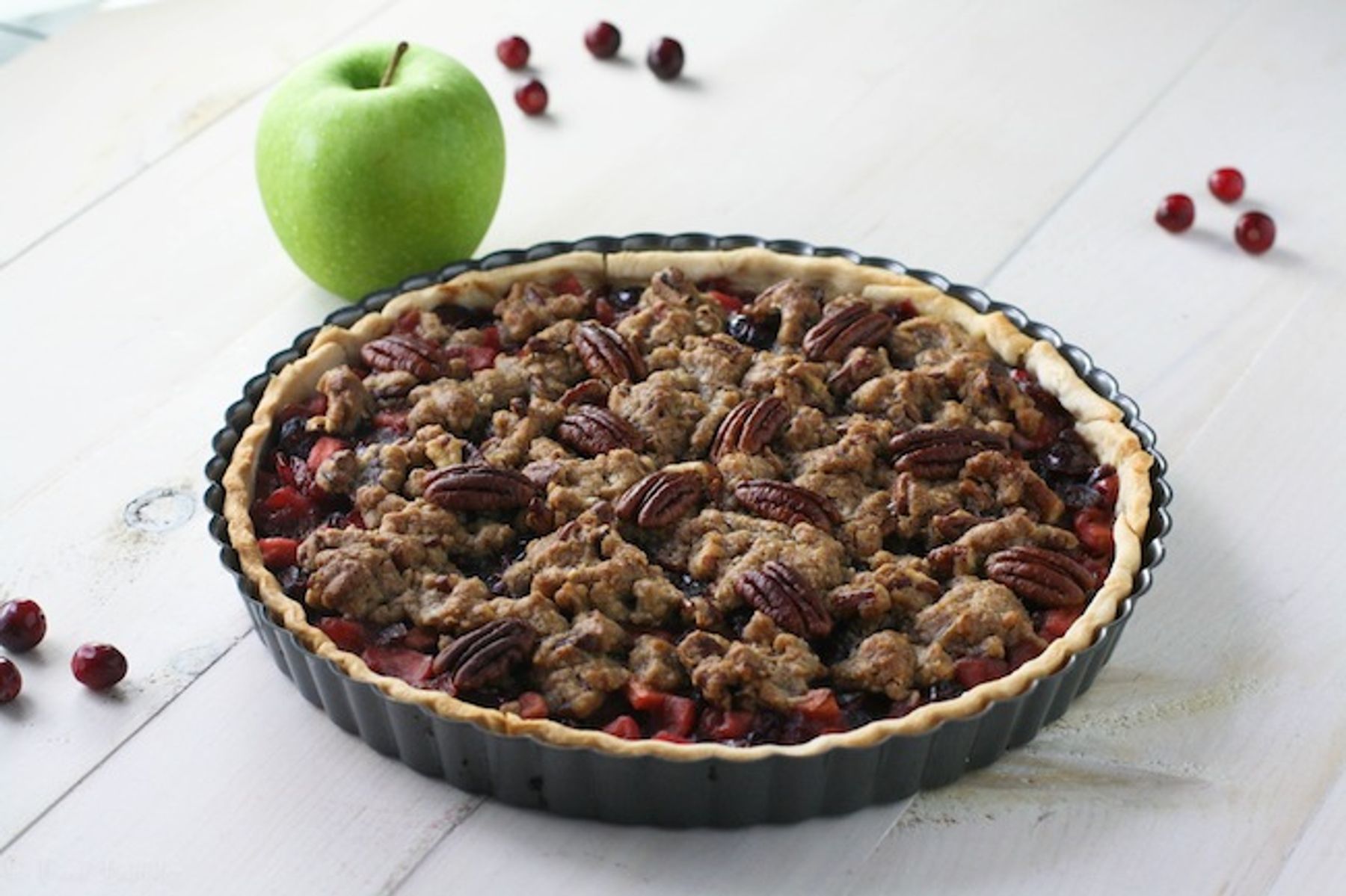 Tart apples and cranberries in a flaky crust topped with sweet, nutty cinnamon pecan streusel for a delightful, easy to make holiday tart.