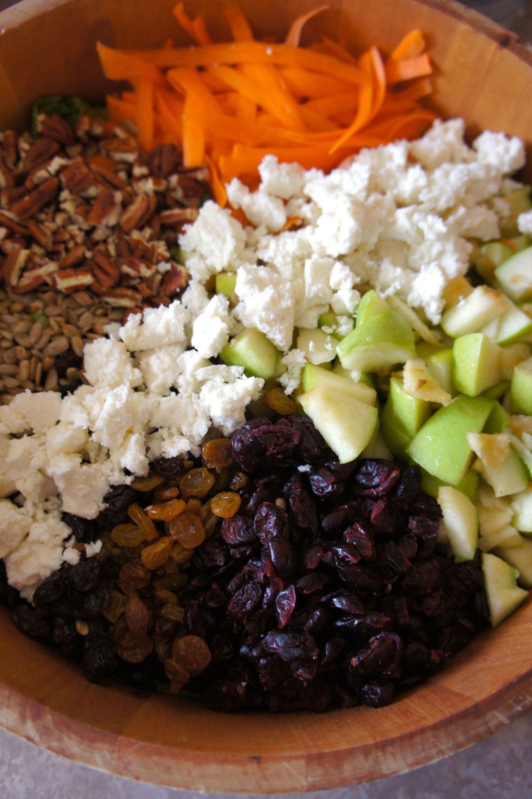 In a large bowl toss together the lettuce, carrots, cranberries, both raisins, nuts,...