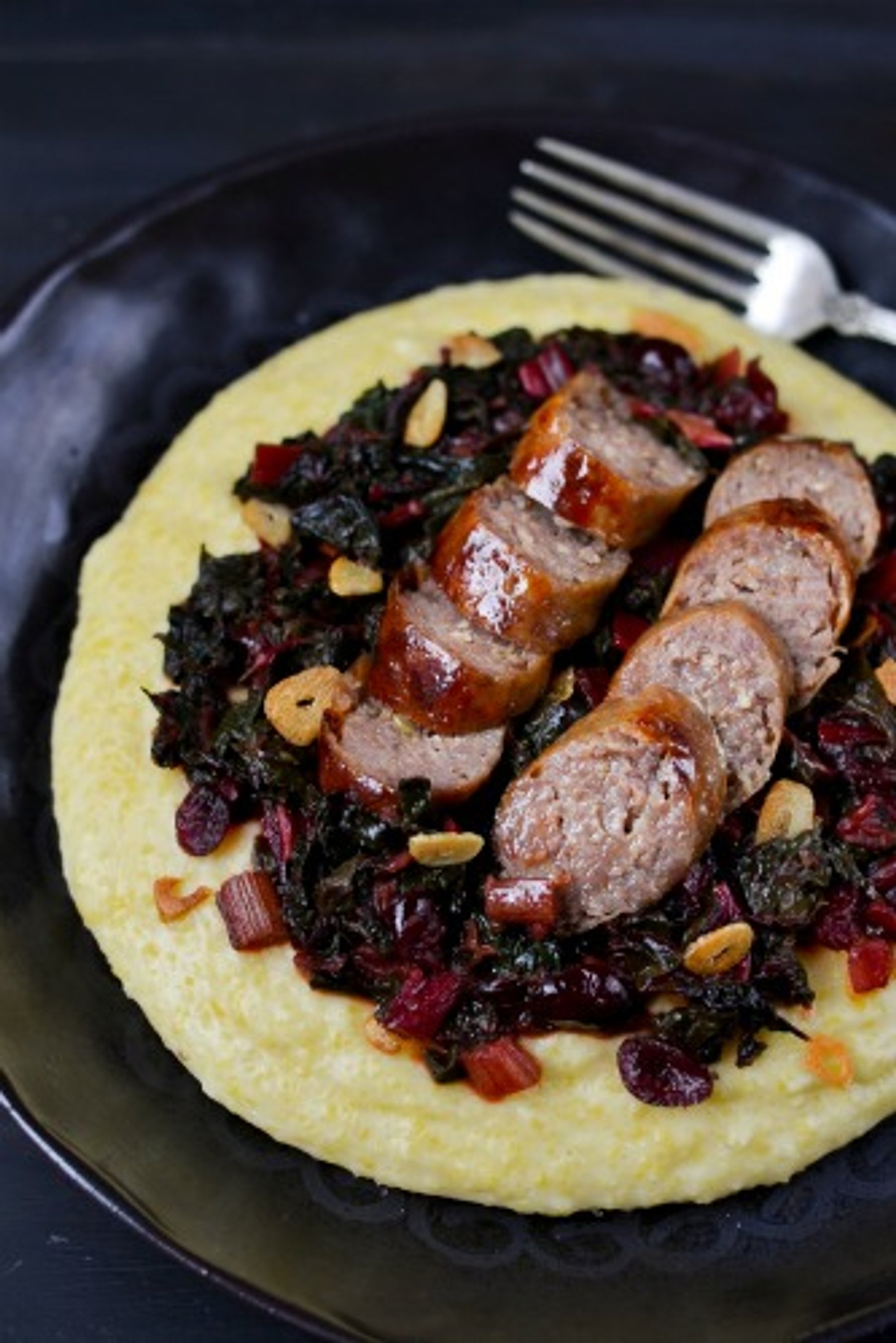 Cranberry-Balsamic Swiss Chard & Roasted Sausages with Creamy Four Cheese Polenta