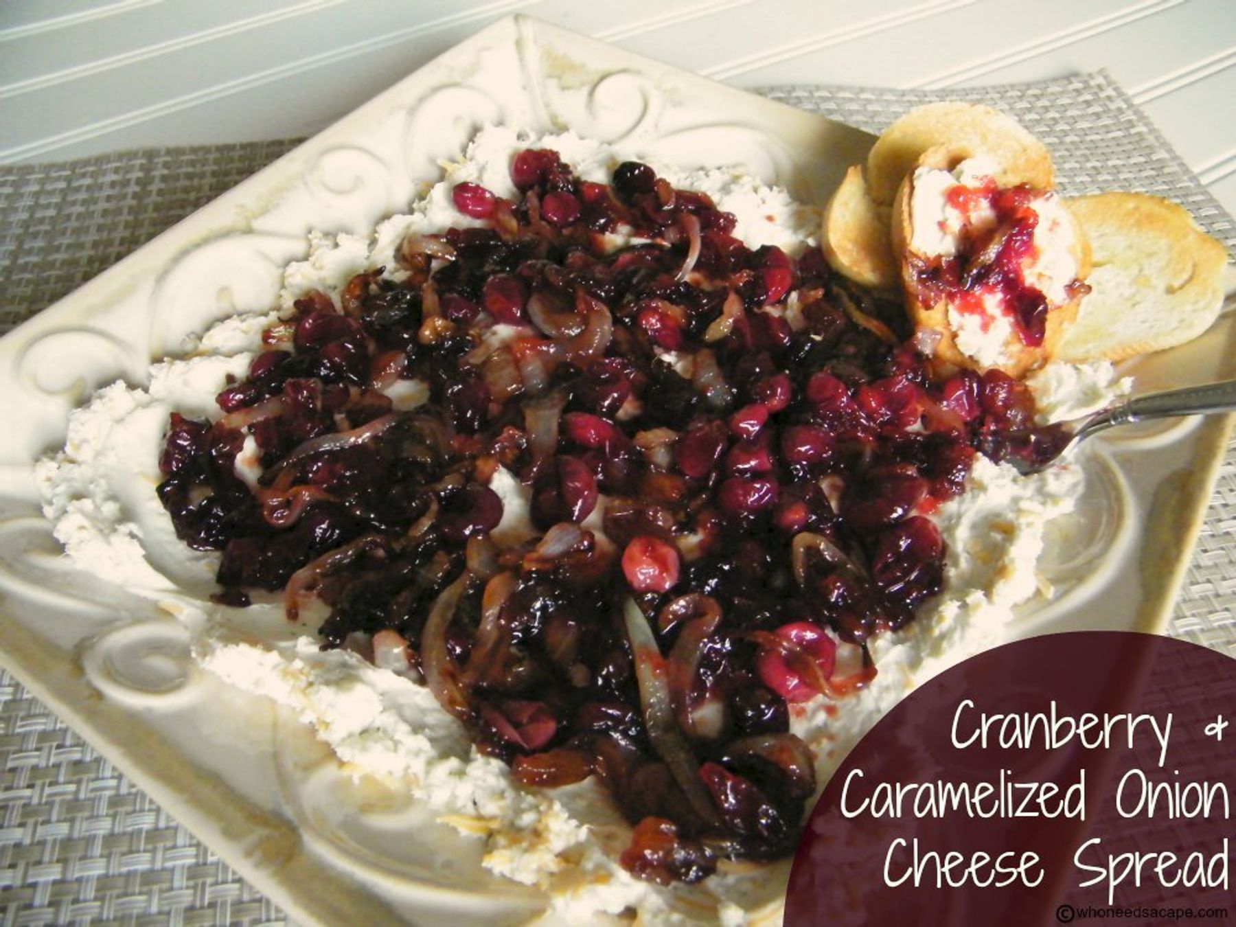 This cheese spread will make a wonderful addition to holiday feasts. With the flavors of fall it blends well with standard holiday menu items. What I like about dips and spreads is the fact you can prep ahead of time and bring out to serve when you need them. The cranberries and caramelized onions give it a bit of sweetness while the blue cheese packs a tiny pungent punch. Grab your favorite hearty cracker or crostini this will be a new favorite!