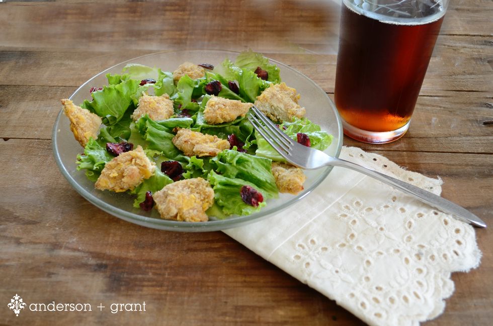 A Super Easy Salad with Breaded Chicken, Dried Cranberries, and Leaf Lettuce.