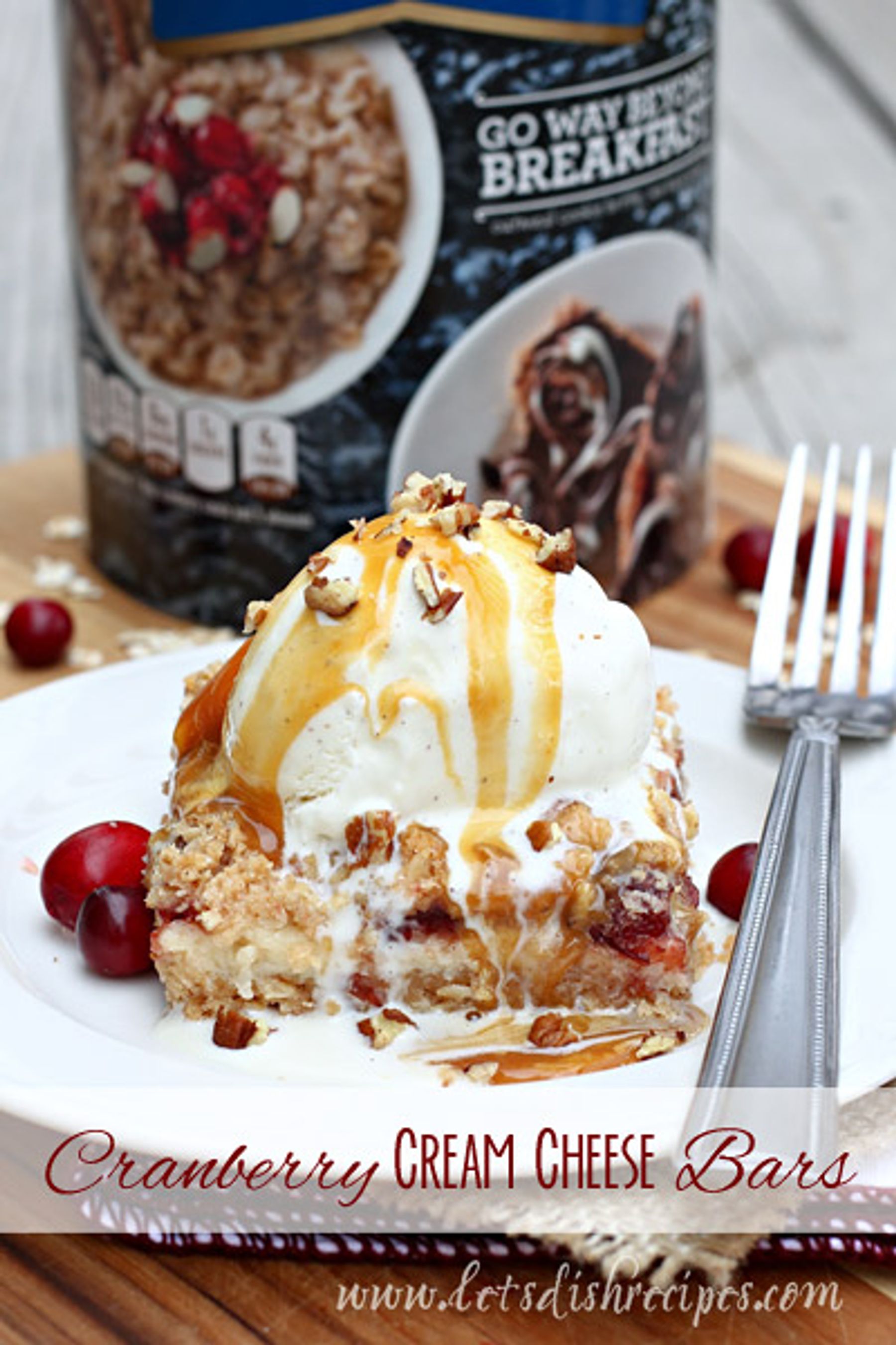 Oat bars filled with cranberries and cream cheese, topped with vanilla ice cream and caramel sauce.