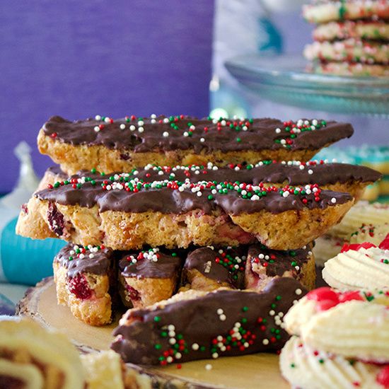 Biscotti packed with fresh cranberries, roasted almonds, and a hint of orange then dipped in dark chocolate. Get the recipe: ofbatteranddough.com