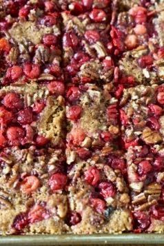A graham cracker crust is topped with a pecan and cranberry mixture creating delicious bars.