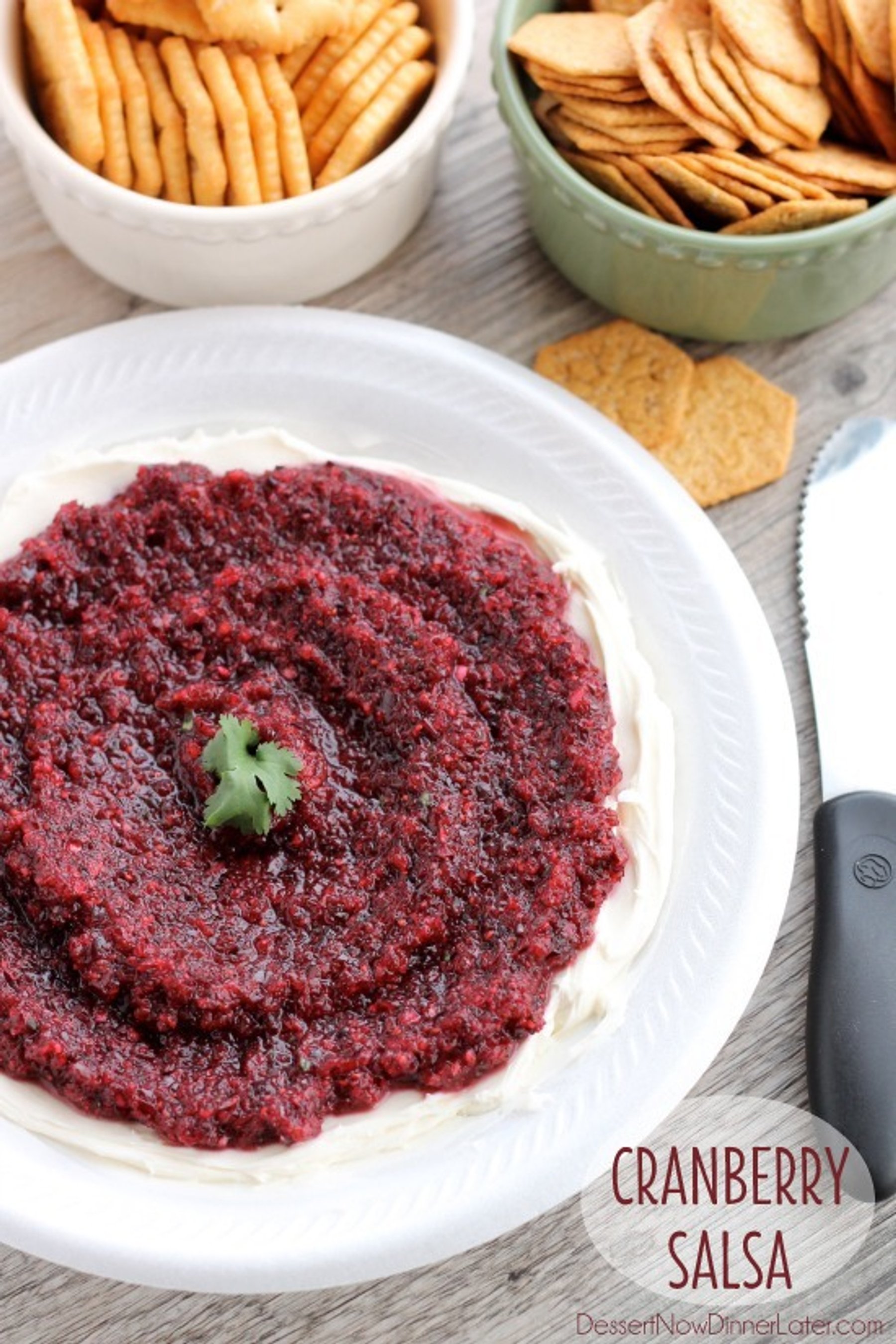 This Cranberry Salsa is a must try appetizer for the holidays this year! It's served over a bed of softened cream cheese for a spicy-sweet savory dip to spread on crackers.