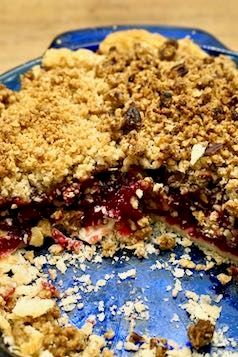 A delicious pie that is a little bit tart and a little bit sweet topped with a streusel topping.