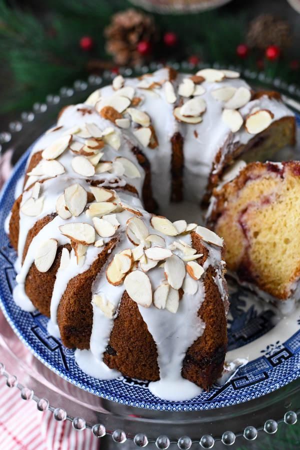 This Cranberry Swirl Sour Cream Coffee Cake is a festive addition to your holiday breakfast, tea party, or Christmas brunch. The rich butter cake includes a ribbon of cranberry sauce throughout, plus a drizzle of icing and crunchy toasted almonds on top. It's a show-stopping morning treat that you can easily prepare in advance!