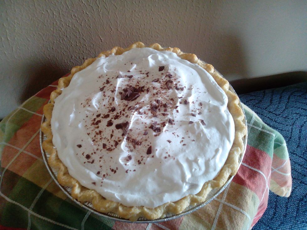 mix softened cream cheese with 1/2 cup powdered sugar and 1/2 cup cool whip spread on bottom of cooled pie crust mix chocolate pudding with 1/2 cup sour cream 1 cup milk 1/2 teaspoon almond extract and one half cup cool whip mix till will blended spread on top of cream cheese mixture top with the rest of Cool Whip