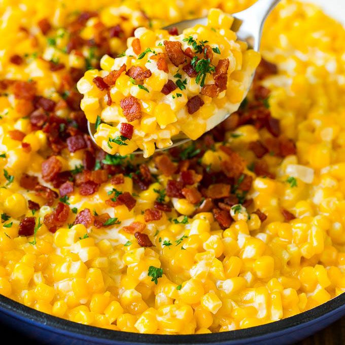 This creamed corn recipe consists of corn kernels simmered in cream sauce, then topped with crispy bacon and fresh herbs. A classic side dish that's easy enough to make on a busy weeknight, yet elegant enough to serve for a holiday meal.