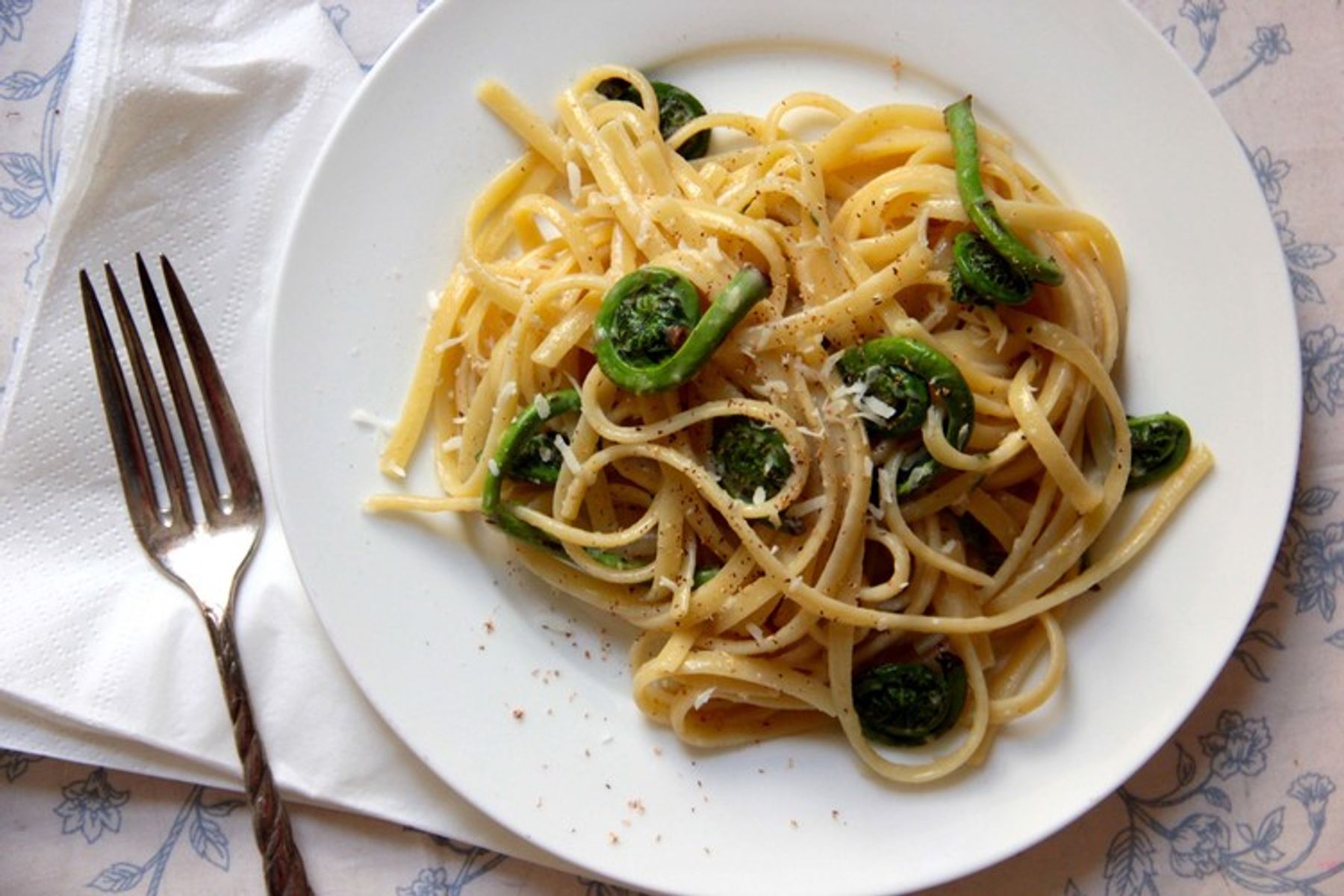 From the foraging of early spring, fiddleheads make a great accompaniment to this creamy alfredo dish.