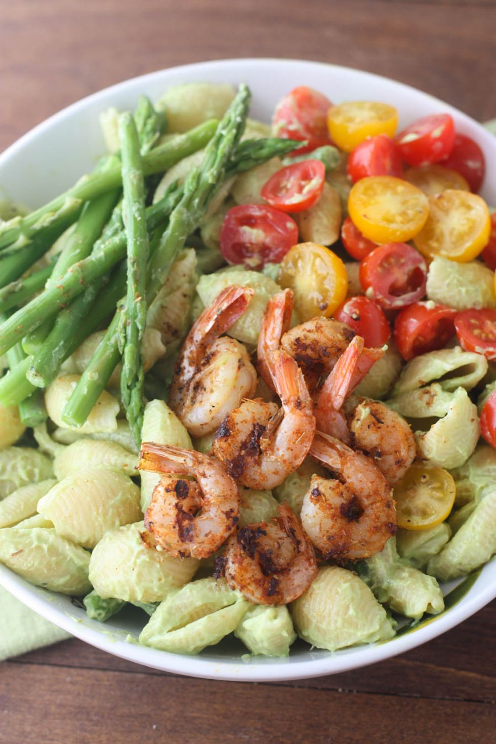 Pasta tossed in a creamy avocado sauce and topped with cajun blacked shrimp, asparagus and tomatoes.