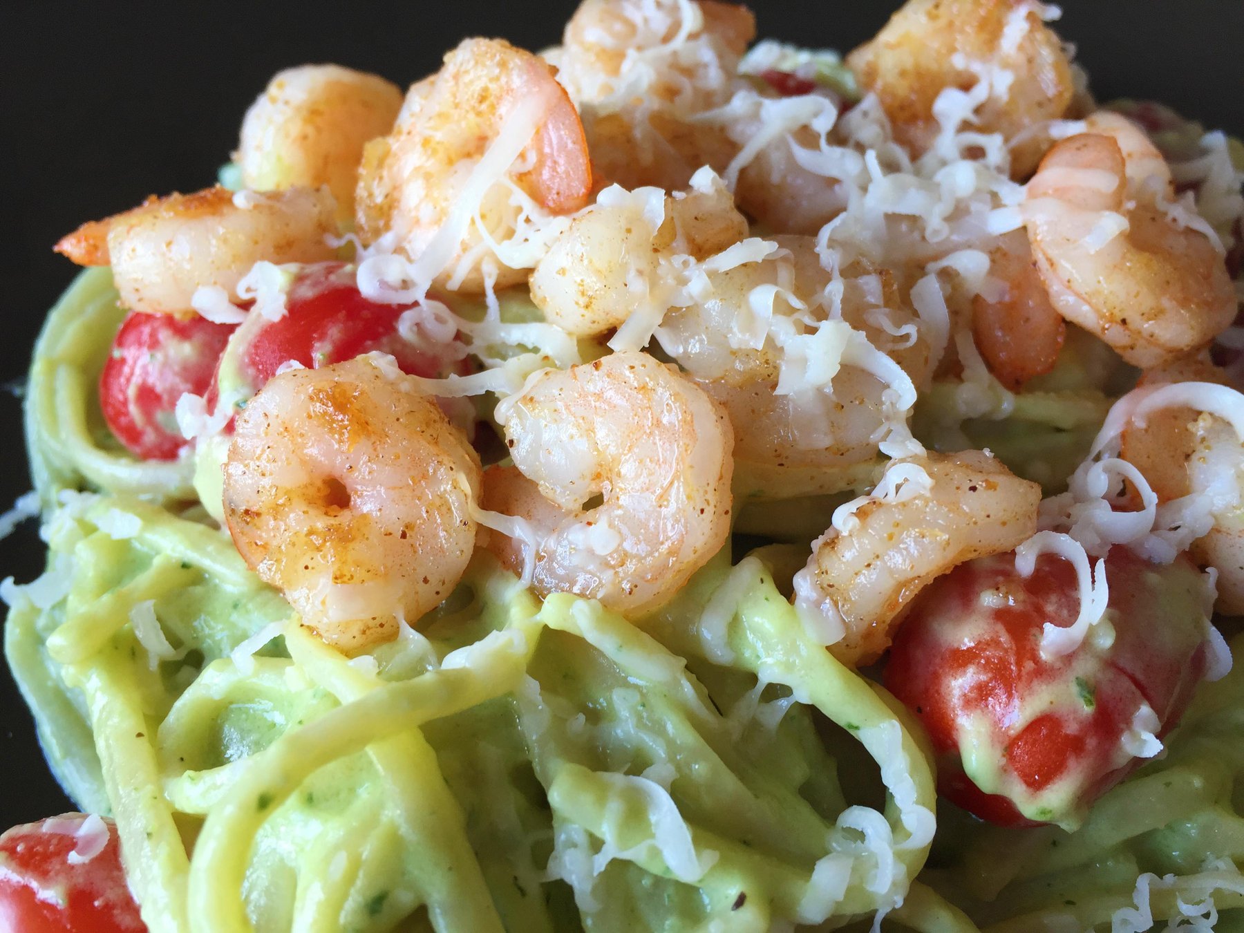Creamy Avocado Pesto Linguine with Spicy Garlic Shrimp