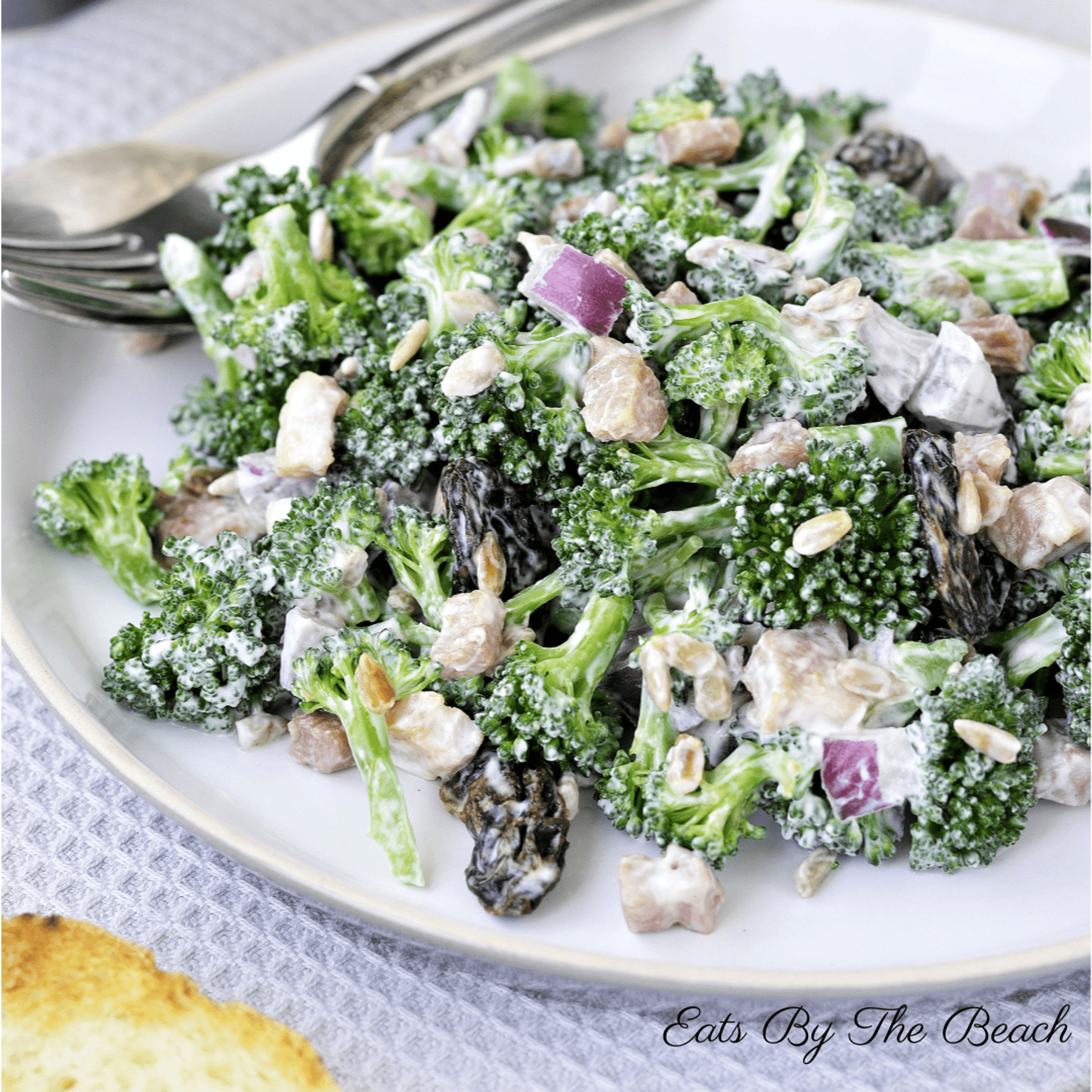 In a large bowl, toss together the broccoli, onion, almonds, raisins, bacon, and cheddar cheese. Toss to combine the ingredients.
