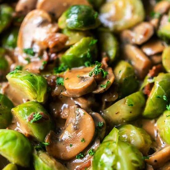 You can easy make these creamy brussel sprouts with cooking cream, bacon, mushrooms, onion and garlic. It's a tasty side dish.