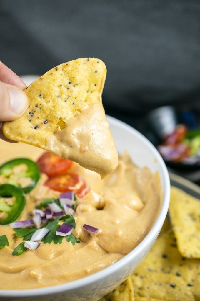 You'd never know that this dairy-free cauliflower queso dip is made with veggies! Creamy cashews and non-dairy milk make the base for this spicy, savory, funky nacho cheese-style plant-based dip.