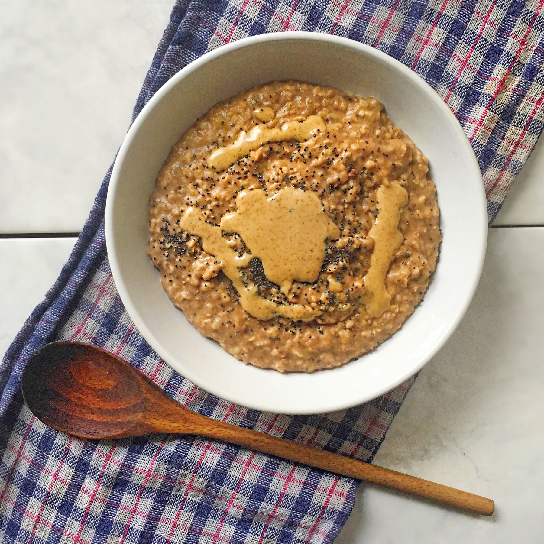 A hearty and filling breakfast porridge that is creamy, soothing, warming and perfectly spiced. Sweetened with banana and served with extra indulgent almond butter and crunchy poppy seeds.