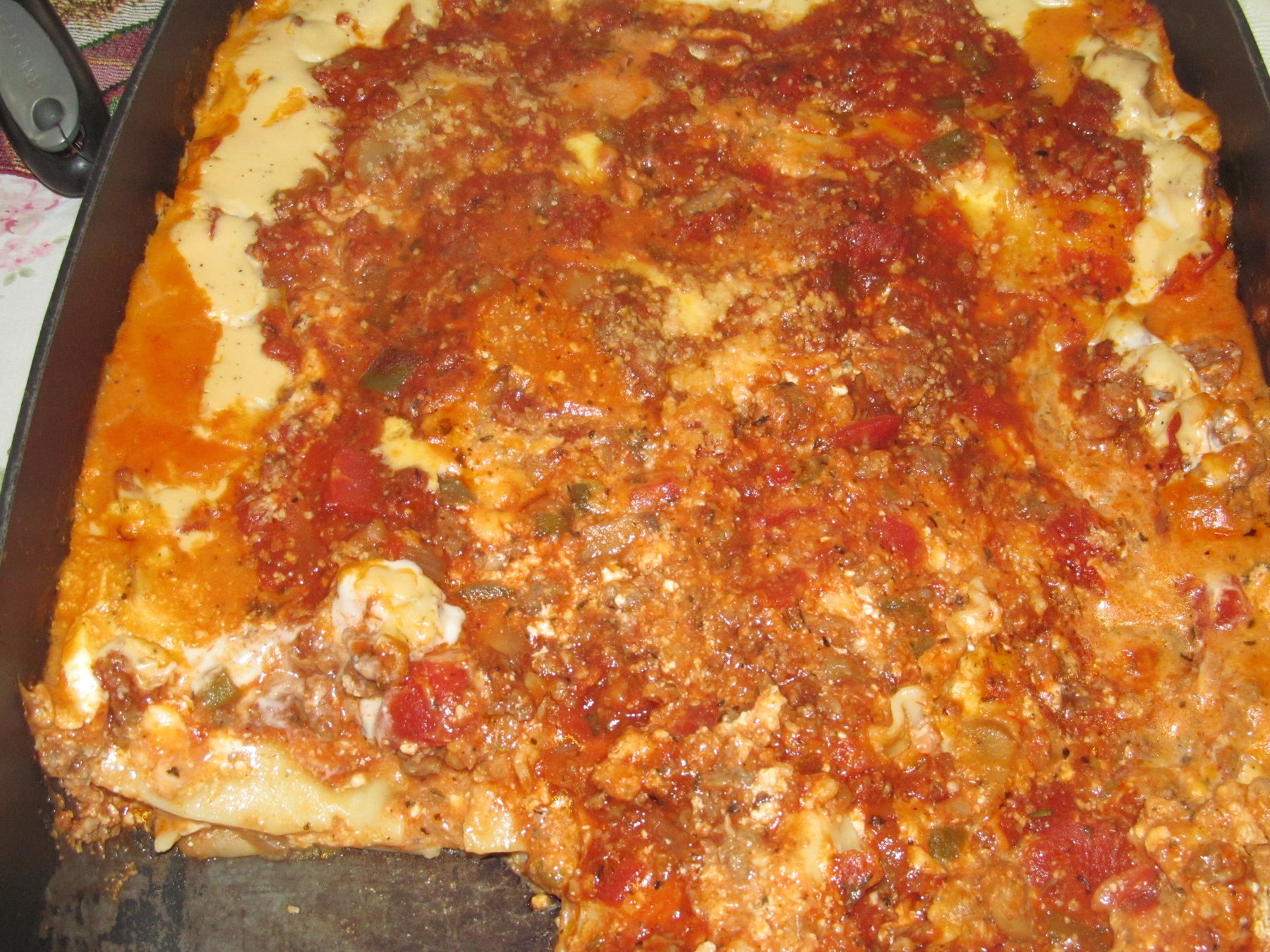 Preheat oven 350. boil lasagna noodles ; meanwhile in large skillet on med heat add garlic, onion, italian sausage, ground beef and cook untill no longer pink; drain; add meat back to skillet adding green...