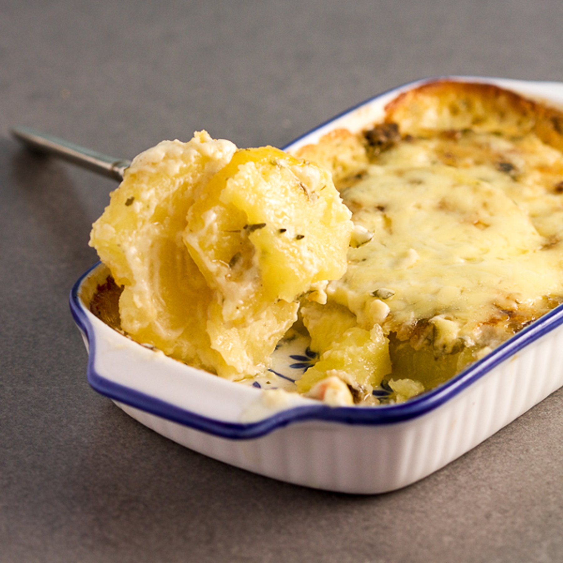 Cheesy potato casserole is a classic casserole achieved by letting the potatoes bathe and bake in a smooth heavy cream sauce, and finishing them off with a topping of grated yellow cheese that melts to a stretchy perfection.