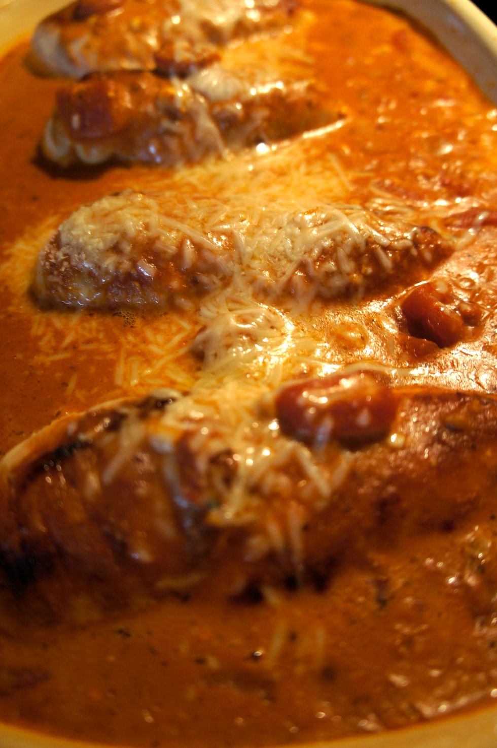 Melt butter in a skillet over medium heat and add chicken cooking until just done. When chicken is done transfer it to a baking dish keeping all drippings in the skillet.