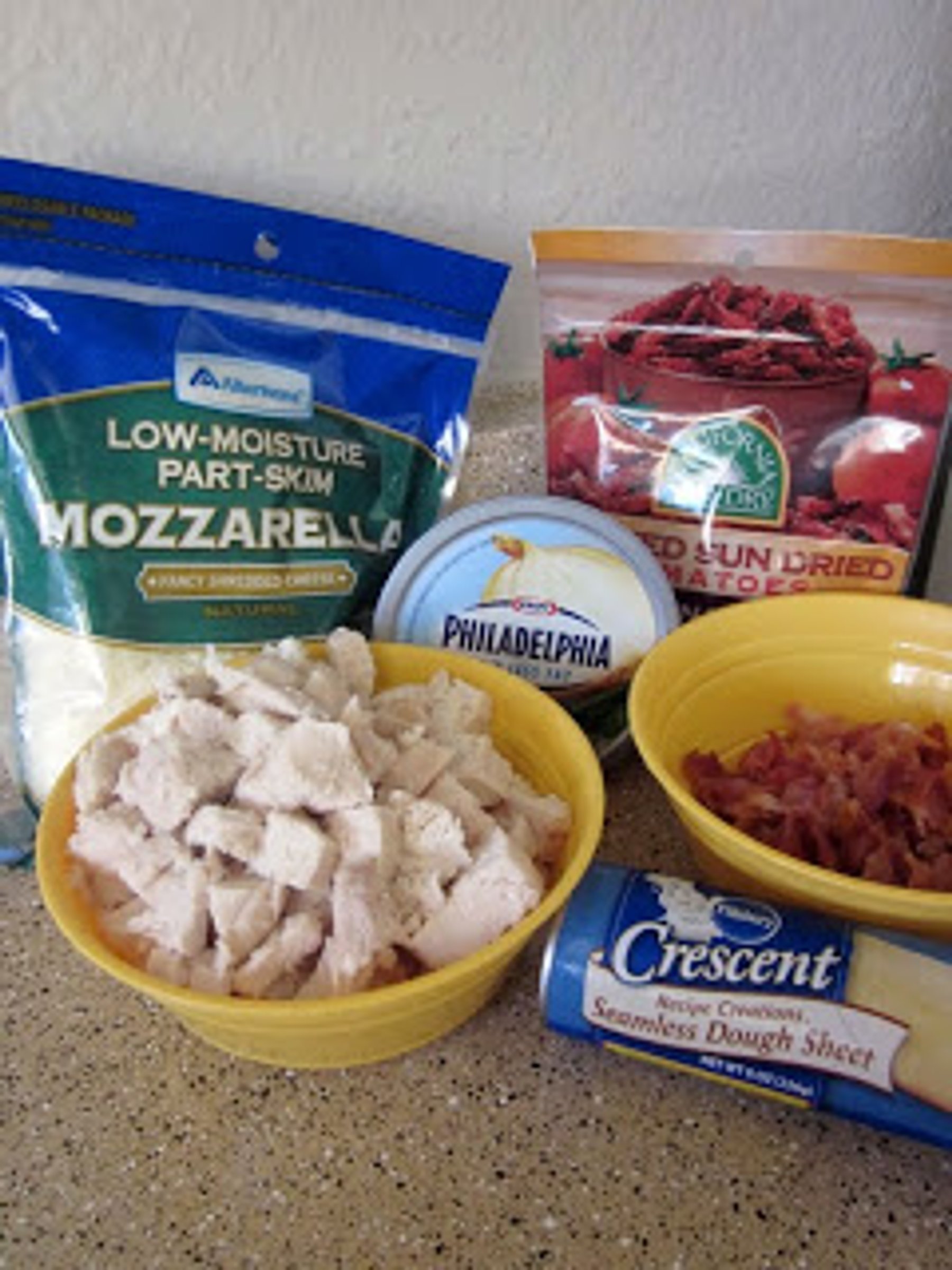 Warm cream cheese in the microwave for 20-30 seconds to soften. Place in a mixing bowl with mozzarella cheese, chicken, bacon, and sun-dried tomatoes. Stir to combine and set...