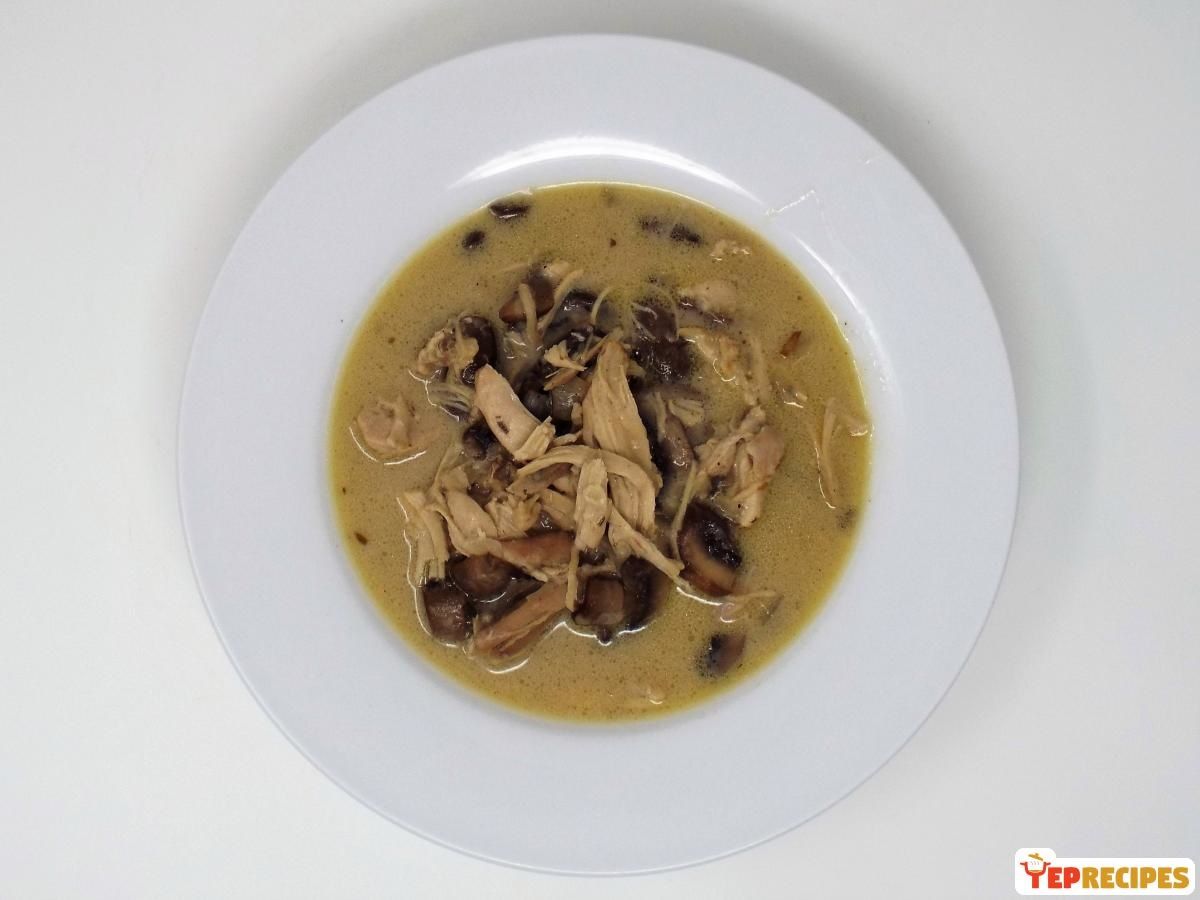 A rich and creamy soup chock full of cremini mushrooms and tender shredded chicken.