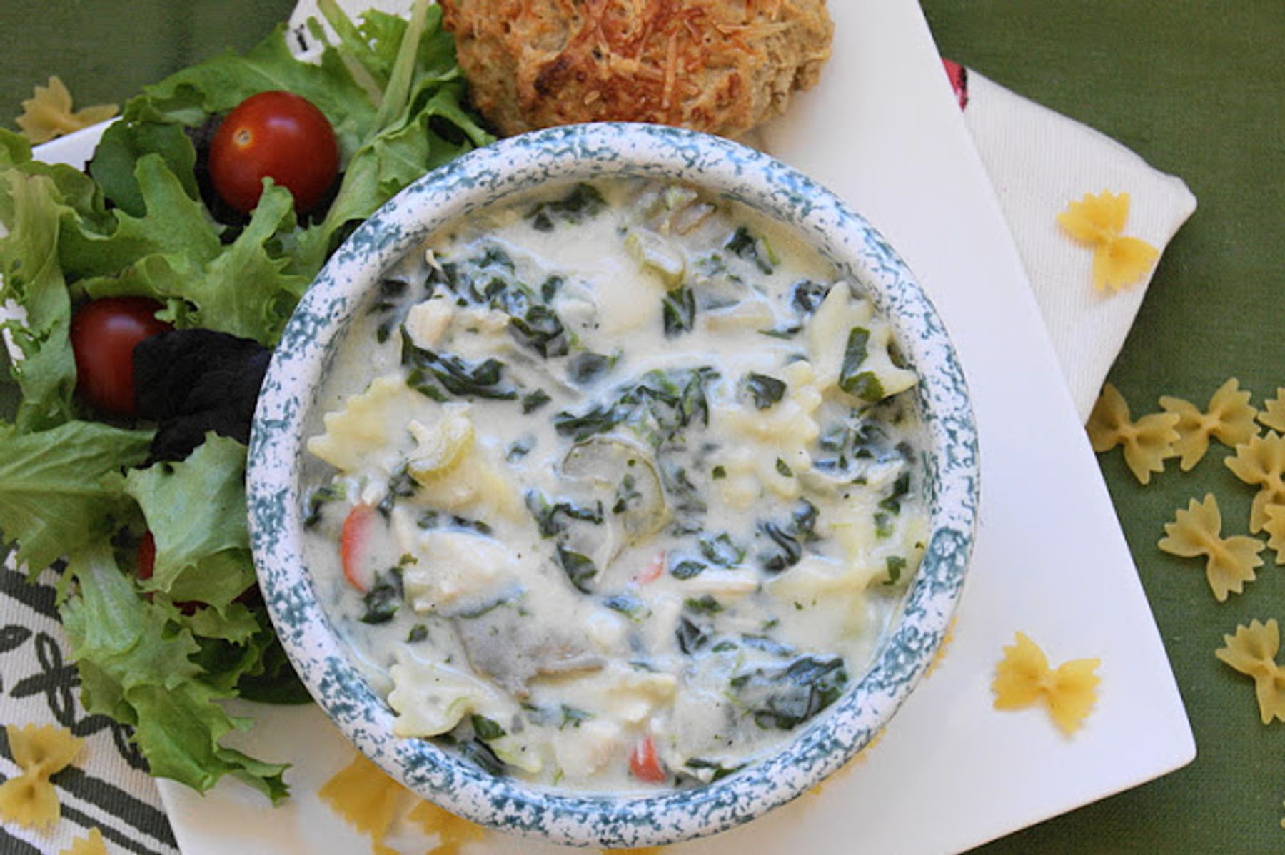 Creamy Chicken Noodle Soup with Brie, Spinach, & Artichokes