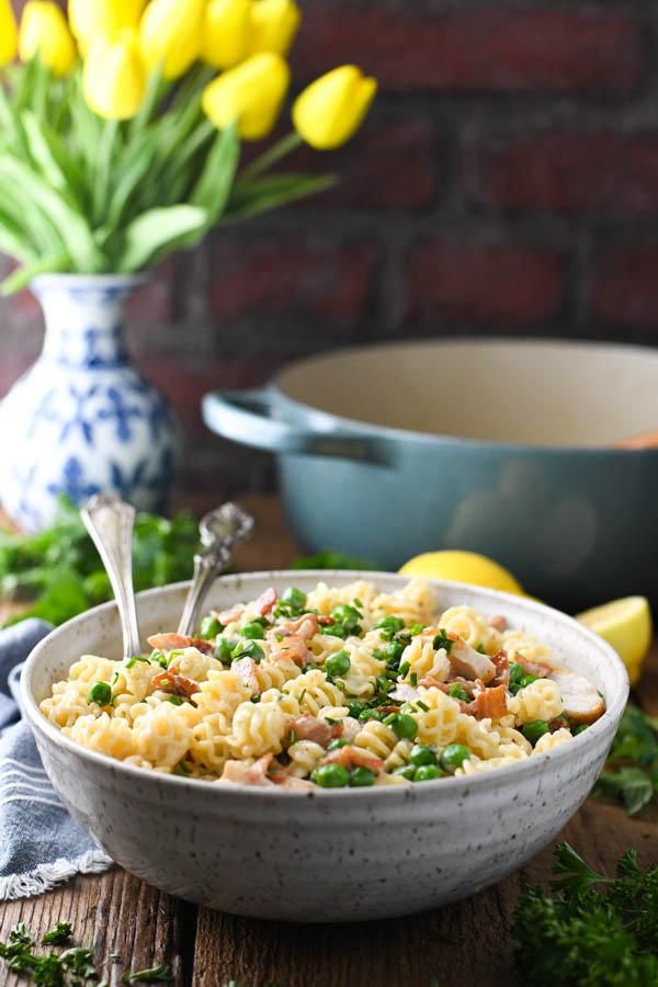 A pot of Creamy Chicken Pasta with Bacon, Lemon and Peas is a satisfying, flavorful, and light dinner that comes together in about 30 minutes. With smoky bacon, golden brown chicken, tender pasta, sweet peas and fresh herbs in a simple lemon cream sauce, this easy meal tastes special enough for entertaining, but it's quick enough for busy weeknights! Pair it with a side of crusty baguette and a green salad in balsamic vinaigrette for the ultimate family feast.
