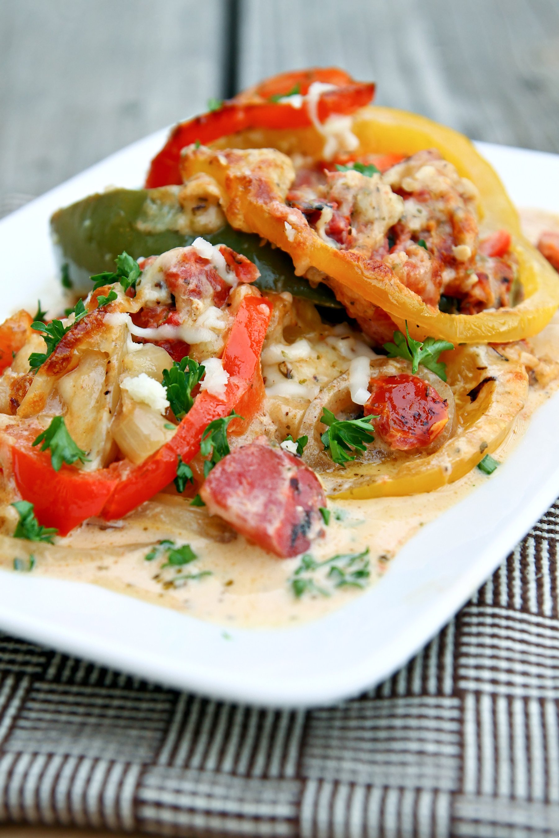 Chicken and peppers in a creamy sauce.