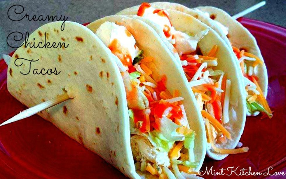 Mildly spicy, chicken tacos with a sauce mixture of cream cheese, cheese soup, and sour cream and a few other things made in a Crock-Pot (slow cooker).