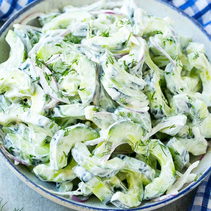 This creamy cucumber salad, also known as German cucumber salad, is a refreshing combination of cucumbers, red onion and dill tossed in a simple dressing. Dill cucumber salad takes just minutes to make and is the perfect side dish for any summer meal.