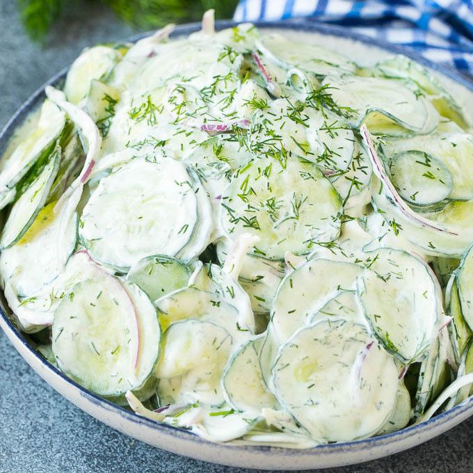 This creamy cucumber salad, also known as German cucumber salad, is a refreshing combination of cucumbers, red onion and dill tossed in a simple dressing. Dill cucumber salad takes just minutes to make and is the perfect side dish for any summer meal.