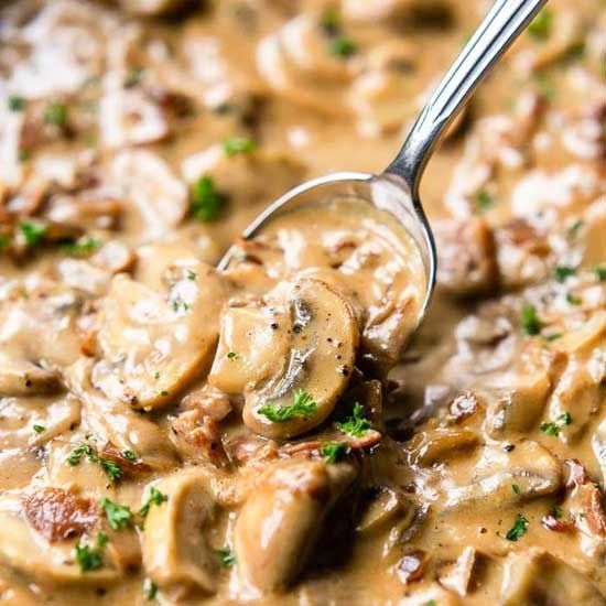 These creamy garlic mushrooms with bacon go with everything. It is a great side dish that is easy to prepare with white mushrooms, dry white wine, garlic, bacon, parmesan cheese and chopped fresh parsley.