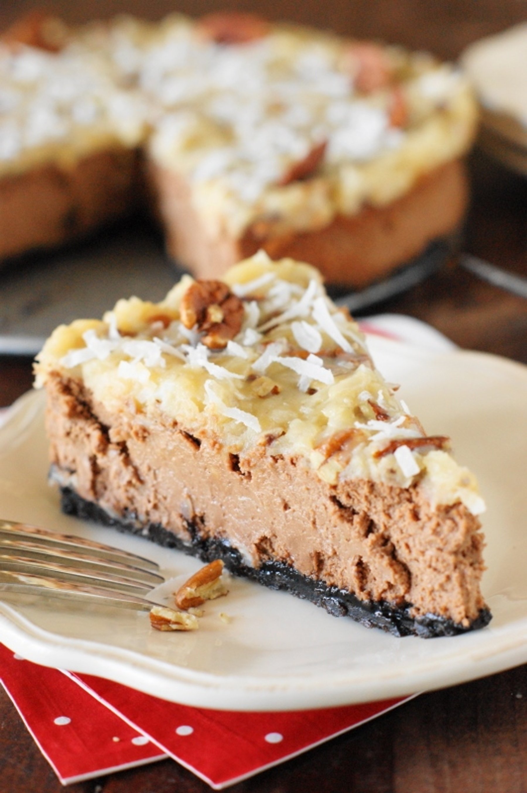 Love German chocolate cake? Give German Chocolate Cheesecake a try! Creamy chocolate cheesecake is baked atop an Oreo crumb crust and topped with the classic coconut-pecan topping from the ever-popular German chocolate cake. The result is one very tasty cheesecake, indeed.