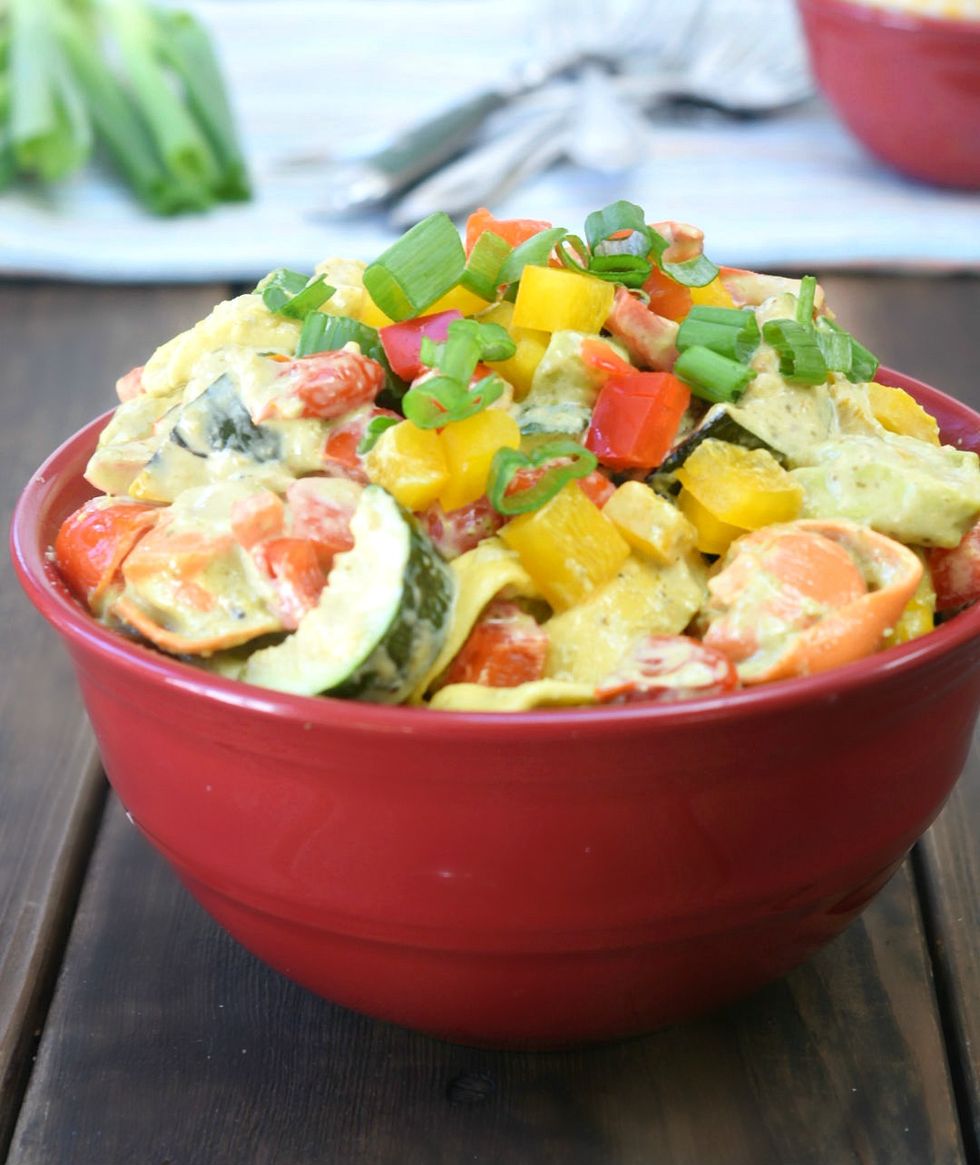 It’s fresh grilled vegetables with tri-colored tortellini, that is mixed together with a creamy pesto sauce. Yum!