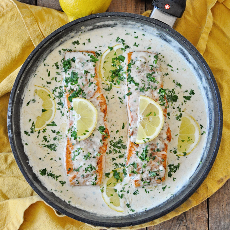 Creamy Lemon and Garlic Seared Salmon Skillet