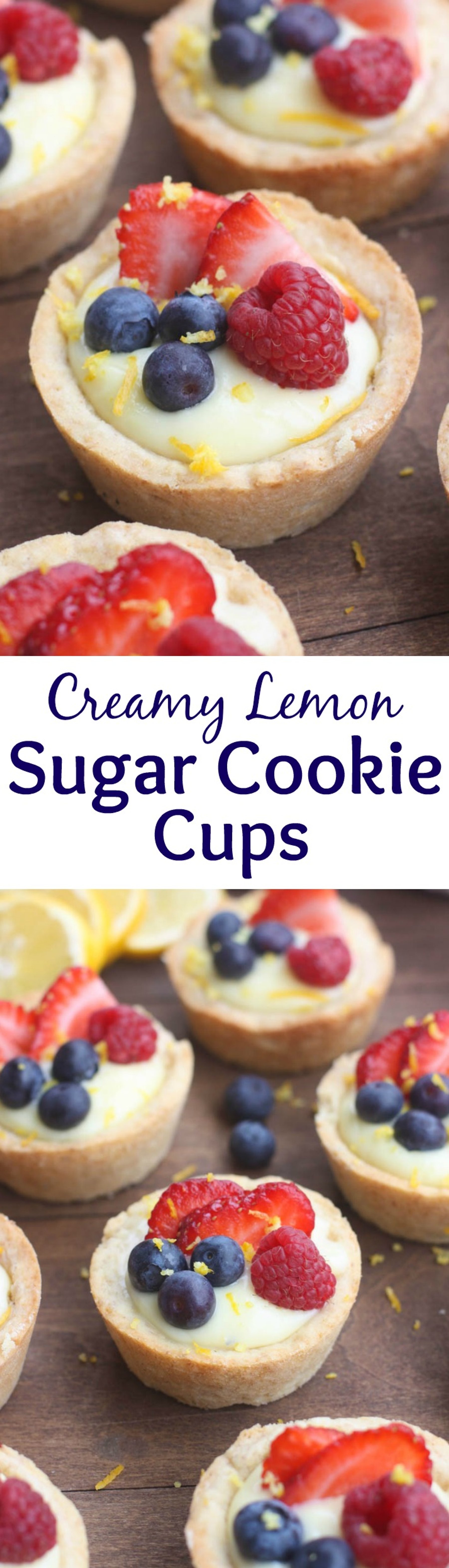 Creamy Lemon Sugar Cookie Cups - my favorite sugar cookie recipe baked in a muffin tin and filled with creamy lemon pie filling. Topped with fresh fruit. A beautiful and easy dessert that will impress your guests!