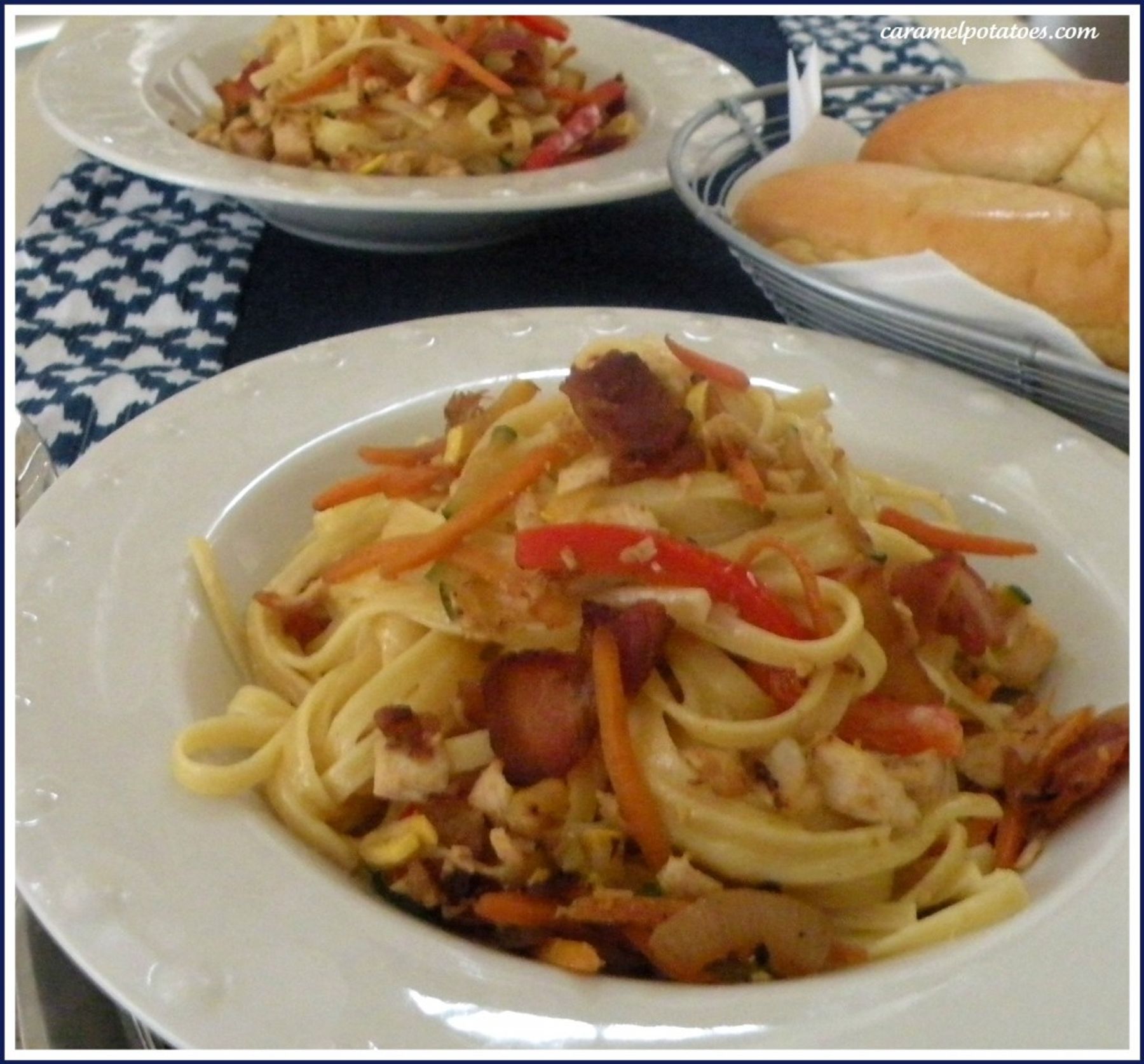 Creamy Pasta Carbonara with Bacon, Chicken and Caramelized Veggies