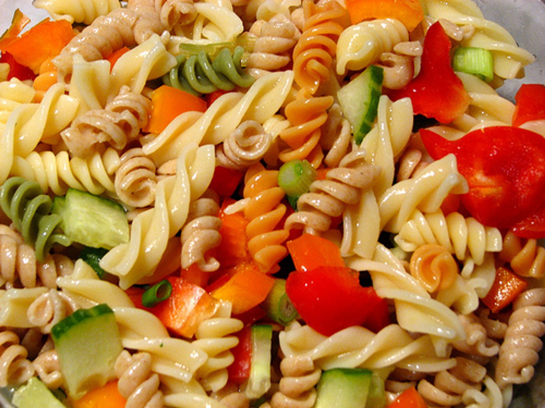 My mother is allergic to eggs and many pasta salads usually contain a sauce that includes eggs. (Mayo, Ranch) This is actually her recipe, with my spin on it!! It is creamy, light and oh so satisfying!! Bring it along to a BBQ once and it will instantly become your signature dish! The great thing about this salad is you can make it ahead of time, the longer it sits the better it tastes!!