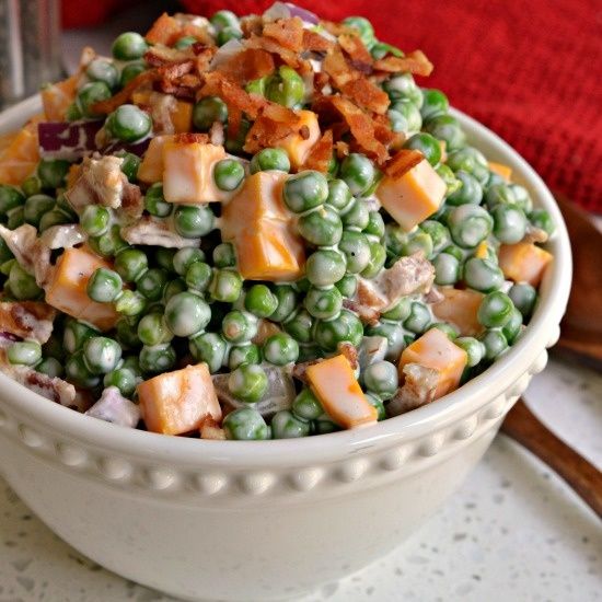 This easy Creamy Pea Salad is one of our favorite summer dishes. It combines sweet peas, crispy bacon, red onion and cheddar cheese in a creamy five ingredient dressing. This tasty salad comes together in less than ten minutes and it is a favorite at family reunions, potlucks and picnics.