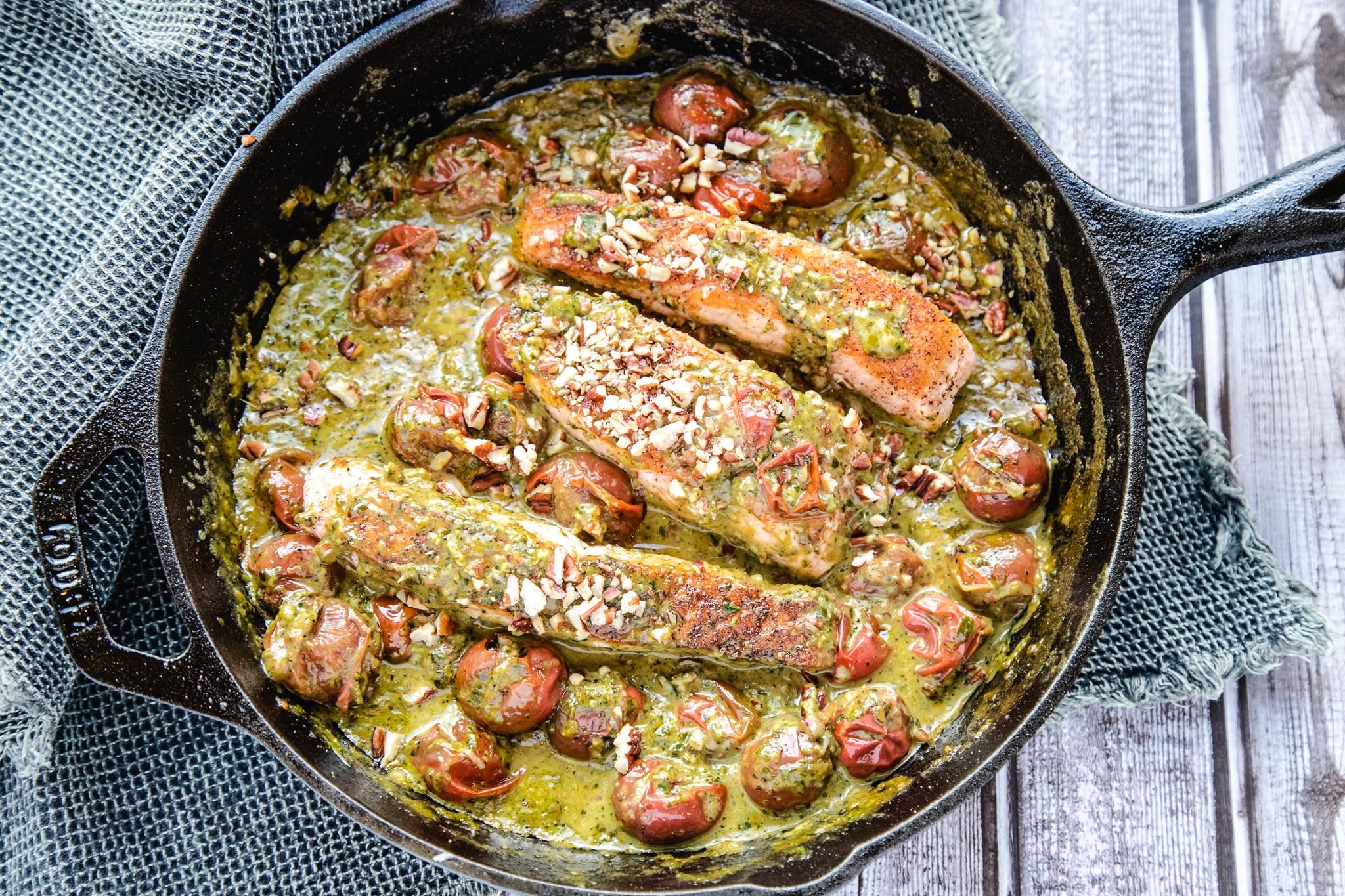 This creamy pesto salmon comes together in about half an hour, making it the perfect weeknight meal. Pan-seared salmon is combined with a quick homemade pesto, roasted cherry tomatoes, a hint of cream, and roasted pecans.