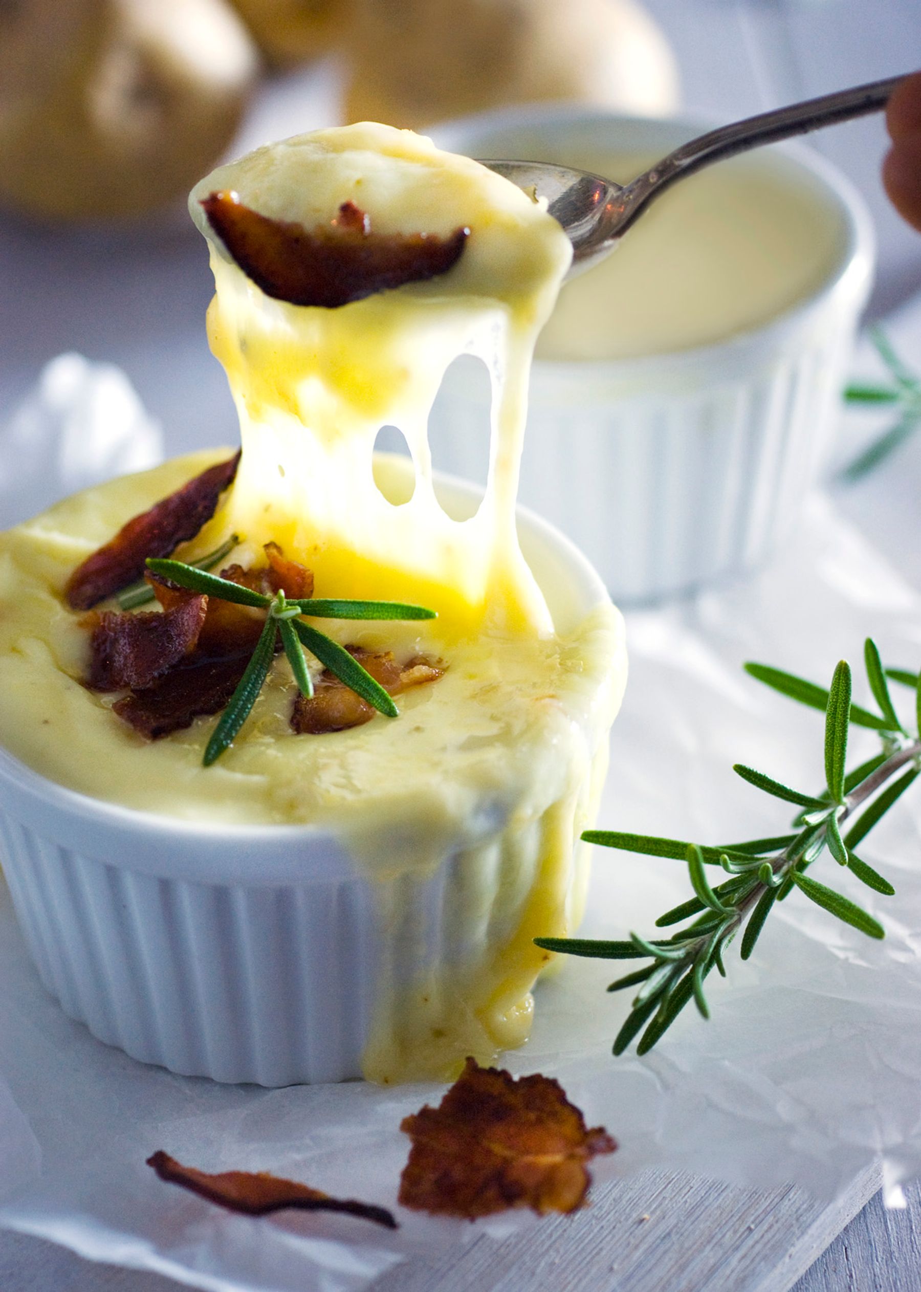 Ultimate creamy Potato Soup with sour cream (Crockpot) topped with melted cheese, crispy bacon and savory Rosemary. Only 15 min prep. Perfect Comfort Food!