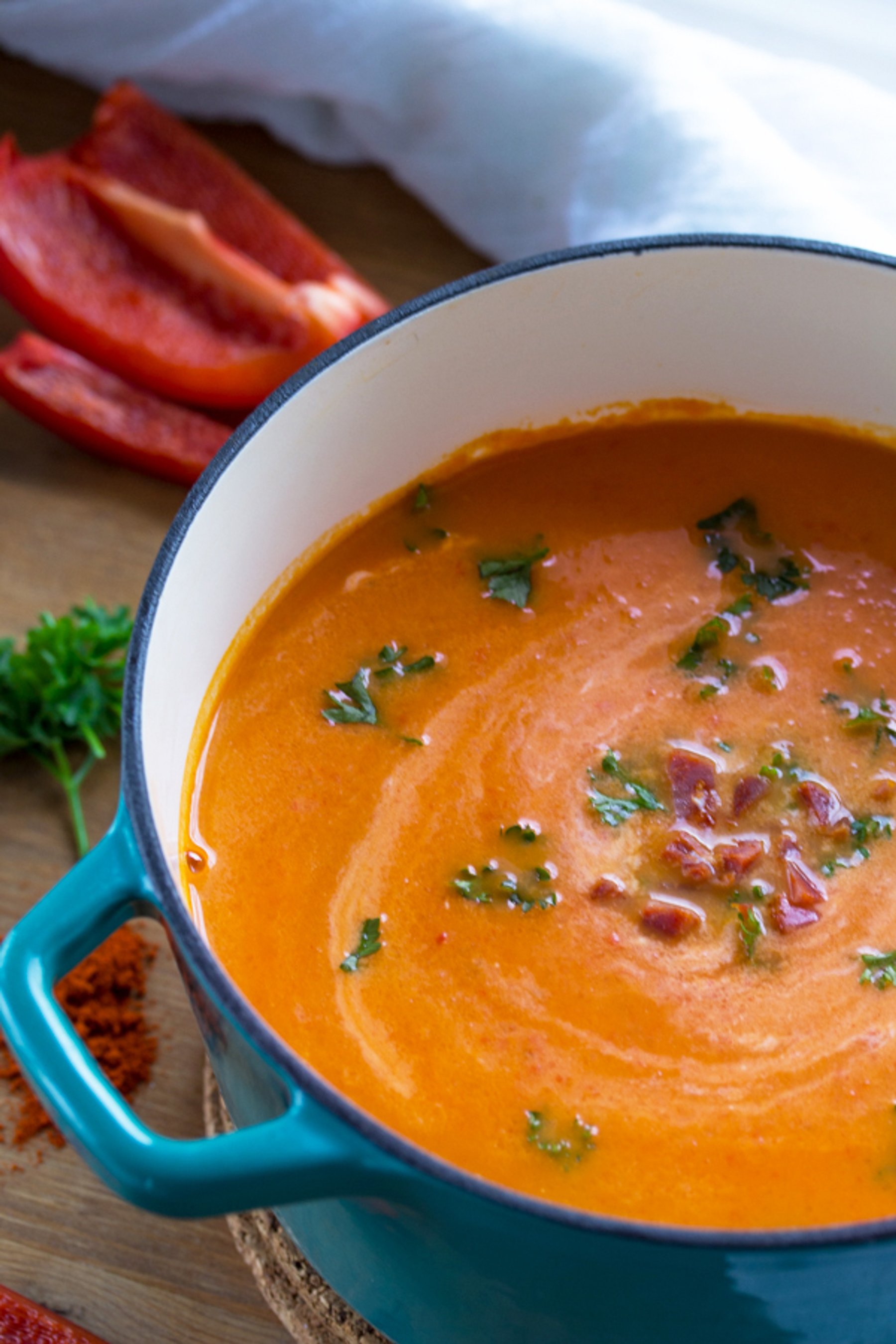A simple and healthy red pepper soup that is served with a dollop of smoked paprika yogurt and a sprinkling of crumbled chorizo.