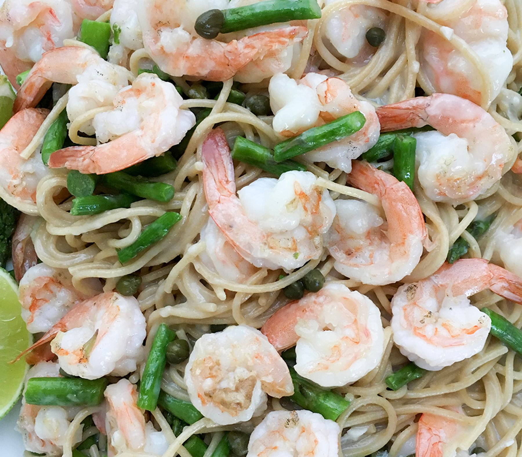 This delightful Creamy Shrimp Asparagus Pasta is actually made without cream. This easy and quick dish is made with fresh ingredients and tossed in a low calorie homemade cream sauce.