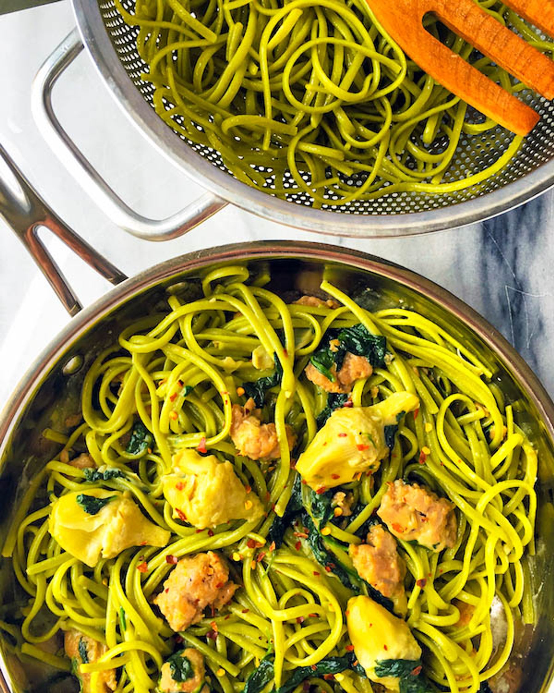 Skip the green-dyed foods this St. Paddy’s Day and celebrate with naturally green Spinach Linguine with a Creamy Chicken Sausage Artichoke Sauce!