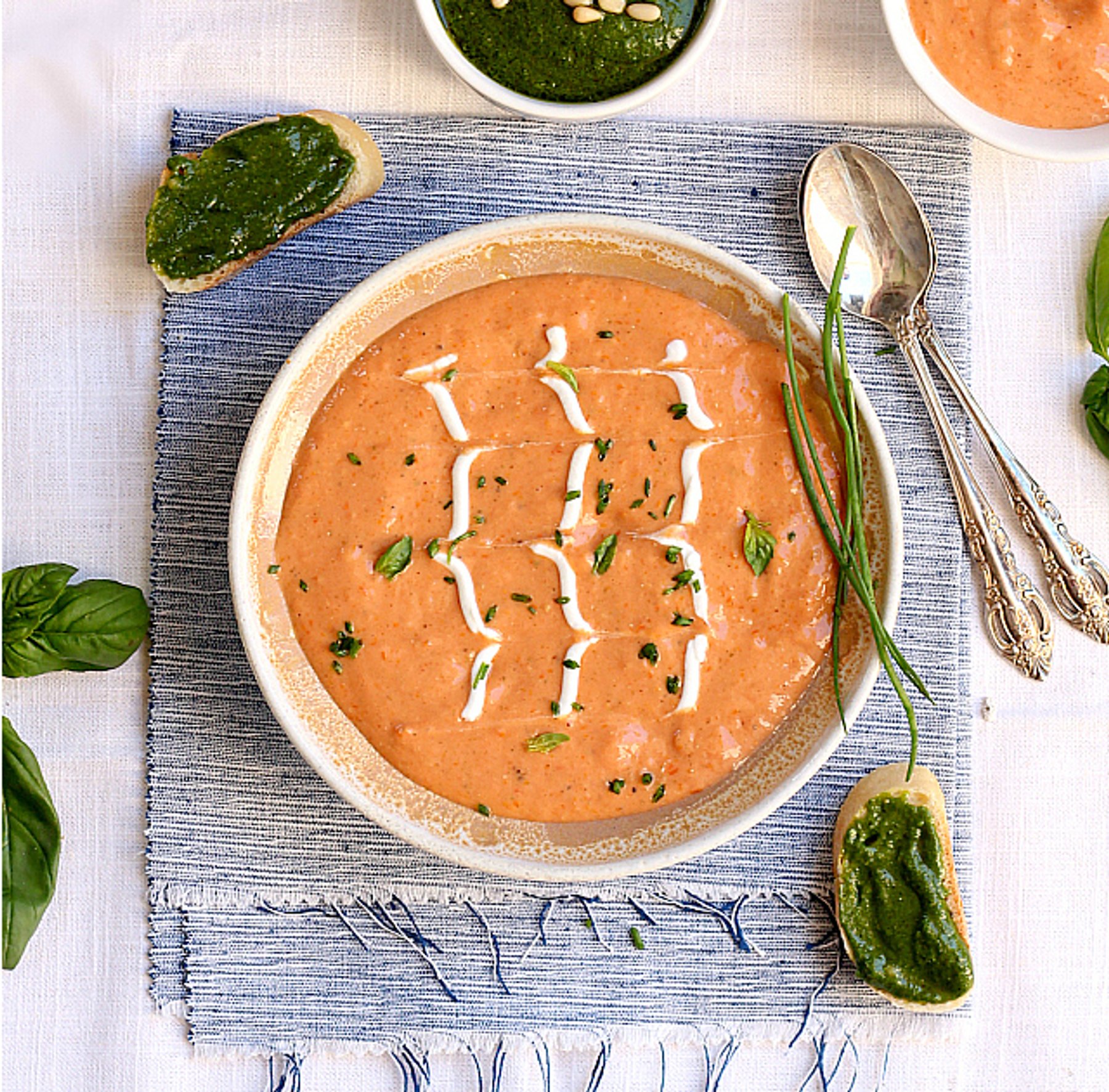 Thick and creamy Tomato basil soup made with tomatoes, basil, garlic and coconut cream (or regular cream) is comfort food at it’s best! Serve this Gazpacho style or warm with a drizzle of sour cream or Greek yogurt and croutons.