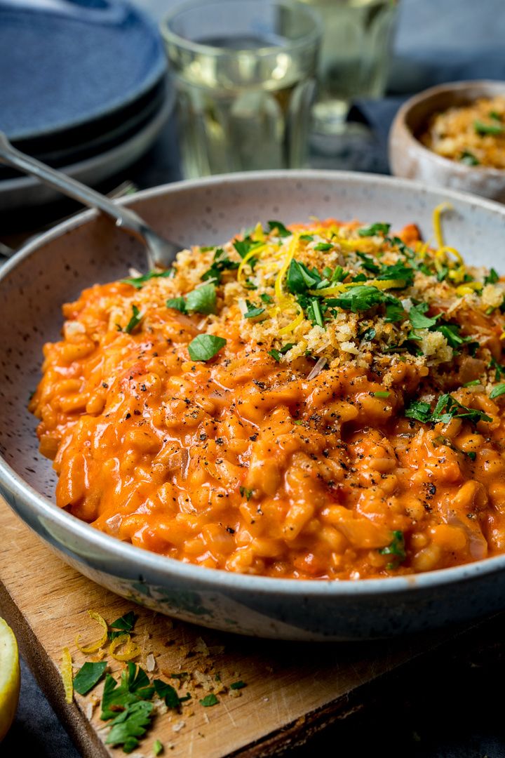 A deliciously moreish Creamy Tomato Risotto topped with crispy garlic breadcrumbs – made with mainly store cupboard ingredients. It's tender and creamy, with a slightly tomato-ey tang and just the right amount of sauciness to make it utterly moreish!